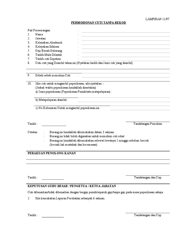 Contoh Surat Permohonan Contoh Surat Permohonan Cuti Tanpa Gaji Mengikut Pasangan from imgv2-1-f.scribdassets.com Check spelling or type a new query. Maybe you would like to learn more about one of these? Borang cuti tanpa gaji guru. We did not find results for: